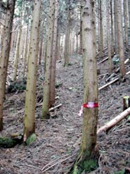 木の幹に巻かれたテープや標識に従い、杉林の中の急坂を上る。本日3座目、