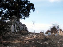山頂に到着。2つの祠(中・右)を囲む杉の木が成長し、その周囲の木々も次第に