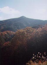 2つの石祠が鎮座し、そのどちらも「北辰妙見宮」だという。 登山道は今回利用した美東町・山中峠からのルートのほか、秋芳町・柏木地区から 秋芳大滝を経由して登るルートも人気があるが、いずれのルートも山頂付近まで眺めはなく、 単調な急登が続く。秋芳大滝ルートには新・旧2つの道があるが、旧ルートは 途中にワサビ田があるため進入禁止とされているうえ、一部道が荒れて迷いやすい場所があるので注意。 (画像は秋芳町側からの眺め 00.11.23) |