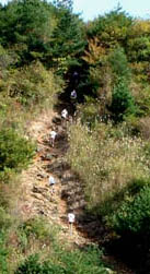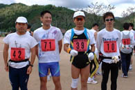 土曜日は1日雨が降り続いたが、日曜日の空は朝から晴れ上がり、 コース上に若干の泥濘が残っていたもののまずまずのコンディション。 心配されていた鳳翩山縦走ルートも、路面はほぼ乾いており特に問題なく通過できた。 レースは、4時間20分を目標にしていたテツ選手が(目標には届かなかったが) 自己記録を更新してゴール。桜井、みっちー選手も4時間台で相次いでゴール。 酒好R選手は登山道でペースを崩し大きく後れをとり、コンディション不調&写真撮影の 和崎はさらにその後を、昨年より約1時間遅れでゴールした。 ☆レース経過は:一升谷の上りで和崎選手を、頂上付近で酒好きランナー選手を抜き、 頂上過ぎでテツ選手、みっちー選手を抜く。下りを先行するがエイドの先の上りでテツ選手に 抜かれる。その後会ったのはみっちー選手だけで10km過ぎと地蔵峠のエイドで話をし、 また東鳳翩山では直ぐ後ろに姿が見えていた。男岳を下ったあたりで両足に軽い痙攣が起こり、 これはゴールまで何回も起こりそうになったが、以前のように休まなければ行けないような 激しい痙攣にはならなくて助かった。20kmエイドの手前でガス欠気味になり、むすび1個と バナナを1本食べたものの、油峠までの舗装路は歩いて上り、その後も下り以外は歩いて、 やっとのことで東鳳翩山に到着。ここからは一応下りになるものの、何カ所も木の階段の 上りがあり、そこでは一段一段歩いて上る。残り8km弱から山を抜けて舗装路に出る。 そこから残り3km弱まで何とか走り続けたものの、ここで約1km程歩く。 最後の2kmは気力で走って、今回も並み以下の体力で完踏した。 (桜井)