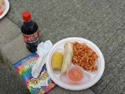 昼食メニューは、マカロニのミートソース和え、パン、スープで茹でたコーン、デザートのゼリーにコーラ。豚汁&おにぎりの国内大会とは大きく異なるアメリカン・テイスト。 メインディッシュの横にある袋の中身は、口に入れた最初の数十秒間が 強烈に酸っぱいキャンデー(Made in USA)。帰りの運転中、眠気覚ましに3つばかり 口に入れたが、ホントによく効いた。 |