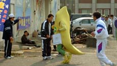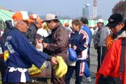 レース後に抽選会 会場内には飲み物の無料サービス、うどんやスポーツ用品などの売店の他、ご当地 名物「バナナのたたき売り」コーナーもあった。 |