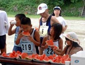 前日の山口県の天気はかなりの荒れ模様だったが、この日の朝は天候も回復し、比較的波もおだやか・・・それでも小さな船は波にもまれて大きく揺れる。船に酔いやすい人はこの時点でリタイヤ確実かも。 30分ほどで祝島に到着。平地は少なく、波打ち際からすぐにはじまる斜面に沿って張り付くように建っている家々。台風に備えて壁や屋根瓦は漆喰で塗り固められている。山口県というよりは沖縄県に訪れたかのような風情が漂う。 13kmの部は8:00にスタート。最初の1kmで海岸線まで坂道を駈け下り、港を抜けて2km手前より上り坂に入る。約2km続く坂を喘ぎつつ上り、その後は海辺まで続く下り坂。坂を下りきった7km地点のエイドにはすいかが用意されていた。1切れ食べて、残り6kmの平坦路を走る。天気は曇り気味で日差しは強くないが、それでも充分に暑く、ペースはあまり上がらなかった。ラスト数百mで坂道と階段を上り(気持ちは「駆け上り」だが、実際はヨレヨレ)、もとのグラウンドにゴール。 ゴール後に飲み物とつまみがサービスされるのが嬉しい。船の出発までかなりの時間があるので、瀬戸内の風景を眺めつつ発泡酒で喉を潤した。海の向こうには光や下松の工業地帯。直線距離にして20kmほどだが、遮るものがないので意外に近く、泳いで渡れそうに思えた。 帰りは、マラソン参加者用の臨時便で、当初の予定より1時間早く出港。島の特産、「不老長寿の果実」といわれるコッコーの実(キウイの原種という)は賞味も確認もできなかった。 ちなみに、伝説によると「1個食べれば千年生きられる」というこの果実を5個漬けこんだ果実酒が、各部門で1位の選手に副賞としてプレゼントされる。五千年生きたい人は、この大会で優勝を目指そう。 (和崎)