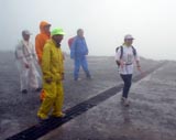 観光道路に出てからは濃霧のため辺りが真っ白で、何にも見えません。早歩きの和崎さんに必死で食いついて時速4〜5kmぐらいが精一杯の歩きです。時々眠りながら蛇行を繰り返しながら、13:40二人で続けてゴール。急遽室堂がゴールになったので何処がゴールやらサッパリ分かりませんが、実行委員長が握手してくれたので、この辺がゴールのような感じでした。 寒いので早く着替えて雷鳥荘の温泉に飛び込みたいのですが、そこからまた雨の中を30分歩かされるとは夢にも思いませんでした。おかげで、せっかく着替えたのにまた濡れちゃいました。 雷鳥荘の完走パーティは出場者が会場のキャパをオーバーしているため、ギューギュー詰め状態でボランティアの方々は起立させられてチョット気の毒でした。 (原田)