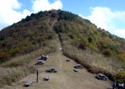 男岳山頂ではまだまだ余裕だ〜と思っていたが、あの下りには参った。ほとんど一人分の幅しかない山道を転がるように駆け下りる。石も多くけが人が出ないのが不思議なくらいだ。