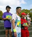 昨年は、ホトトギスさんも宿まで来られて前夜祭に参加されましたが、昨年本当に残念なことになってしまいました。今回思いかけずホトトギスさんのお母様がマラソンのスタート地点にお見えになり、私達全員に声をかけていただきました。最近退院されたばかりだそうで、まだ歩くことはできないが記念とするためにウォークに参加を申し込まれて、メダルとTシャツを手にしておられました。そう言えば昨年は山頂から走って下山途中にお会いし声をかけていただきました。またお元気になって一気登山等に参加していただきたいと思います。 (桜井) 今回はペースメーカーを勝手に利用しゴールを目指しました。 K氏に離されると今度は、これもスタート直後から視界に入っていた女性(女性3位?)に乗り換えましたが、○田さんやめ○ろ〜さんのような不○な気持ちではありませんよ。一時は視界から消えかけた彼女ですが、ゴールが近づくにつれ差が詰まってきましたので、何とか抜きたいともがきましたが結局交わせないまま、数秒差でゴールしました。 3回目の挑戦で一番歩いたように思いますが、ペースメーカーのペースが良かったのか、結果的には3分少々自己記録を更新できました。 (テツ) スタート後、満員の歩道橋では揺れに任せて飛び跳ねながら渡りきり、川沿いのコースでテツさんに抜かれました。ロープウェイ乗り場あたりで、和崎さんに抜かれましたが、給水中にカメラをバックに収めてる間に、「しめ、しめ、今のうち・・・」と、こっそり先行しました。(和崎さんと走る場合は、和崎さんが写真を取ったり、エードで食事している間に、気づかれないように、そ〜と走り出す<こっそり先行作戦>を実践しています。)しかし、<こっそり先行作戦>の効果も長続きせず、石段でヒーヒー言ってる私を尻目に、今回もニッコリ笑って抜かされました。(ガックリ!) 賞品は昨年に続き、ネクタイをゲット。昨年のネクタイはスゴイ柄のネクタイで忘年会のかくし芸専用のようでしたが、今年のネクタイは絞めて恥ずかしいことはないようです。 (原田) 上り一辺倒のコースは、走っている間はきつかったですが、足や膝にあまりダメージが残らないのは助かります。 それにしても、体が重いです。大山のように山頂で石を捨てて身軽になって下りてこられればいいのですが、前夜祭や地獄蒸しのせいか、登る前より重くなって帰ってきたような気がします(体重計は恐くて乗れません)。 ホトトギスさんのお母さんと写真の見送りを受けて9:00にスタート。中村さん方式で後からぐんぐん追い上げて・・・最初に見つけたのがめたろ〜さん。SPAビーチを出た直後から「息が上がる」と弱音を吐いていましたが、そのまま一緒に"揺れる歩道橋"を渡り、境川河川敷の桜並木をしばらく走りました(気が付くと姿が消えていました)。続いて、南立石の公園内で桜井さんに追いつきました。こちらもかなり苦しそう。写真を撮って、さらに前の2人を追う。