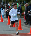 天気は晴れで日ざしはまぶしいのですが気温が低く、両足の筋肉がこわばって歩くのも不自由な状態。記録も順位も考える気になれず、とりあえずゆっくり走ってからうどんとぜんざいを食べようという気持ちで、長袖Tシャツ+長ジャージという「昼休みジョギング」スタイルでの参加。天気がいいのでレース中にも写真を撮ろうと右手にカメラ持参でのスタートとなりました。5分20秒/kmくらいのペース走で前半5kmを流し、コース上から先日登った大竹市の傘山や瀬戸内海を眺めながら、ふと気づくと足どりがずいぶん軽くなっています。ジョギングで関節が適度に暖まって動きやすくなったようです。 7kmを過ぎると、5kmあたりまでは遠くに見えていためたろ〜さんがだいぶ近づいてきました。こうなると赤い色に発奮して、というか市房山の再現というか、上り坂だったのですがペースを上げてなかむらさん含む(女子の部2位でした)3〜4人を一気に抜き、めたろ〜さんと併走していたmaruさんもまとめて抜き去ることに成功。ラスト1kmの上り坂で再びめたろ〜さんに抜き返されるのではないかと恐れていたのですが何とか逃げ切り、記録は50分48秒の28位でした。去年より2分以上遅くなっていますが、最初は6分/kmで1時間前後が目標だったので、自分としては予想以上の好成績でした。 ハコさんは去年の記録を更新して、41分台でした。年末年始を挟んでも勢いが止まりませんね。 (和崎) 皆さん寒い中お疲れ様でした。 去年は39歳以下の部で参加でしたが、今年はなんと壮年の部となっていました・・・・少しショック
