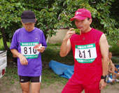 スタートからしばらくは昨年同様の少し涼しい曇り空で、湿度が高いのが気になりましたがこの時期にしては比較的快調なペースで折り返しを通過。 しかし、折り返し後の上りの途中から急に大粒の雨が降り出し、ピークを越えて下りにかかるころには全身びっしょり。道路の脇に小川や水たまりが続々発生し、気分はリバーマラソン。最後の急な上りは、暑さはしのげても勾配のきつさは変わらず、かなりの失速。ゴール前のグラウンドは水を引いたばかりの田んぼ状態で、ラインが見えないので適当にコーナーを回ってゴール。木の下で雨やどりしていると、しばらくしてめたろ〜さんが37分台でゴール。さらにその後から桜井さんもゴールしました。 今回、8.15km男子34才以下の部で、めたろ〜さんが見事第2位の栄冠に輝きました。めたろ〜さん、来年も入賞のチャンスがありますので頑張ってください。 (和崎)