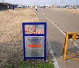 10qを過ぎて第1折り返し点を通過すると,当然追い風が向かい風に変わります。風を遮る物が何一つ無い河川敷で向かい風をまともに受け,早くもペースダウンに見舞われました。とその時招待選手の山口衛里選手が10人くらいの男子選手を引き連れて私を追い抜いて行きました。どうやら山口選手は3°を切るペースで集団を引っ張っていたようで,私も一瞬付いて行こうかと思いましたが,自分のペースが落ち気味だったので自重しました。それでも23q過ぎの第2折り返し点までは山口選手の姿を前方に捉えることはできました。