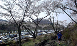ロープウェイ乗り場の桜は満開。駐車場は満車。それを横目にラスト4kmの登山道へ。
