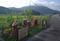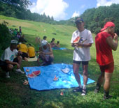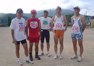 受付後、川でスイカを冷やそうと思って川への降り口を探し,1Kmほどスイカを抱えてコースを下りました。川の水は冷たくスイカはよく冷えました。それからアップがてらスタート地点まで走りましたが、早朝でも既に暑くて汗が止まりません。レースは8時20分後方からスタート、URCのメンバーはめたろ〜さんが前方に見えるだけです。しかし,その姿もどんどん遠ざかっていきました。中村さんも3Km過ぎの登りの途中までは見えていたのですが,そのうち見えなくなりました。 ゲレンデは歩き,その先の急な坂も歩いて上りました。昨年と同じように8Kmを約1時間、9Kmを約1時間11分で通過,最後の1Kmはいつもよりは苦しくなく1時間25分弱でゴールできました。また,下りも今年は何とか走って下ることができましたが,足に痙攣が起こる寸前でした。トマト2個とスイカを食べましたが今年もソーメンは食べませんでした。 (桜井)
