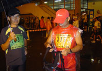 44Km地点あたりまでは小雨からやや強い雨と絶好のコンディションで調子よく走ってきました。ここからは蘇武岳への上りに入り歩きです。上りは苦しいのですが,雨が降っていて今までよりは楽に上ることができました。49Km(88Kmは37Km)手前のエイドめたろ〜さんを再発見,ゼッケンをはずして完全にリタイアでした。 50Kmは6時間30分で通過,51.5Kmの関門(12時)では残り10分でした。しかし,コースが変わって2Kmほど今までより先に進んでいるし,下りに入っては足の調子も良く快調に走っていたつもりですが前後にはいつものようにランナーがいません。射添会館の手前の下りも走って下りましたが関門(15時)の8分前に到着です。
