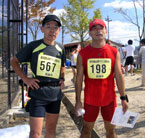 10時10分にハーフの部がスタートし、最初の1kmは渋滞でなかなか前に進めません。1kmを過ぎて広い一本道に出ると、ようやく走者の間隔が開いて前に出られるようになります。今回は前半でしっかり貯金するつもりで、かなり飛ばしたはずなのですが・・・4km過ぎでめたろ〜さんに抜かれてしまいました。えっ、まさか?さっきの体調不良発言はいったい何??と思いながら、5km通過時の自分のタイムを見ると26分もかかっており、全然飛ばしてなかったことが判明しました。その後、残り4kmまではずっとめたろ〜さんの後を追うことに。さらに8km地点を過ぎると、急に息が苦しくなりペースダウン。理由はわかりませんがこちらも体調不良です。折り返しを過ぎるとすこし回復しましたが、めたろ〜さんとの距離は離れるばかりで、今日はもうあの赤い点に追いつくことはできないのか。。。とあきらめモードで残り5kmを過ぎると、なんと!数百mは離されていたはずのめたろ〜さんが、数十m先を走っているではありませんか。 しかし、残り4km付近には最後の上り坂があり、坂の手前で抜いてしまったら、上りで抜き返されてそのまま逃げ切られてしまう可能性がある。上りを過ぎてからスッと抜き去りにかかろうと、計略を巡らしながらゆっくり後をつけていく・・・つもりが、どんどん差が縮まっていきます。めたろ〜さんもどうやらかなりへばっているようです。これなら駆け引きなしで行けると確信し、上りの途中でペースを上げて一気に抜き去りました。 そのまま逃げ切り、キジに苦しめられた昨年よりは速かったものの、2分しか短縮できませんでした。 来年こそは・・・! (和崎) | ||||||||||||||||