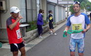 佐陀を過ぎると出雲平野の平坦なコースとなり,tsuganiさん,maruさんも好調を維持し,10°はおろか9°も切ることは確実の状況でした。私は78q地点園町エイドから91q地点東林木町エイドまでを最後の受持ちとしました。宍道湖岸に出ると向い風が強く吹き抜け,12時を回って気温も上昇してきました。更に前を行く走者も見え辛くなり士気を高めるのに苦労します。加えて何だかんだで30q以上を走った体には非常に辛い状態でした。それでも交通信号に従い狭い歩道を走って何とか三つ順位を上げました。90q地点を過ぎたらペースアップと思っていたら,その前に東林木町のエイドがありtsuganiさんに襷を渡しました。何か狐につままれたようでしたが,エイドの位置がプログラムと違っていただけでした。これまでも距離表示やエイドの位置がプログラム記載の数字と会わないような気がしていたのですが,これで納得しました。とはいえtsuganiさんには実際1.5qも長く走ってもらうわけで申し訳ない気持ちになりました。しかし,tsuganiさんはそんなことにもめげず7°50′台でゴールに姿を現しました。
