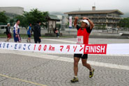 さて、レース全体を振り返って見ると、前半は時速10キロペースを維持したいと思い何とかそれをクリアできました。(50キロ通過は4°55′)後半は予想を上回る向かい風があったものの曇空のまま気温が上がらなかったので助かりました。そして80〜90キロでは、いつものようにずるずると歩きが入りましたが、うれしかったのは45〜55キロくらいまでゼッケンbPの大会常連Oさんとしばし並走させてもらったことです。「今年もサブテンですか?」と聞くと、「後半次第ですね〜」とさらっと言われるあたり余裕ですね。毎年タイムより完踏できればいいのだという無欲な走りは自分の理想とするところです。