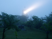 御津からは佐陀までの19qを受け持つことになりました。走り出してからすぐ島根原発裏側の厳しい上り勾配が始まり,脚にかなり堪えます。それでも前を行く走者を一人また一人ととらえて一番苦しい起伏区間を抜け出しました。すると,50qの距離表示があり,時計を見ると出発から3°58′が経過していました。頑張れば7°台でのゴールも可能ということで,恵曇港までの急坂を下りました。坂を下りきるとブロディさんの姿が見え,追い抜き際に声をかけると調子はあまり良くないとのことでした。恵曇エイドでは配給の握り飯一個を食ししばし休憩して再出発です。ここから先は横手林道崖崩れによりコース変更があった区間で小さな起伏はあるものの比較的平坦な道が続きますが,全行程の半分を過ぎ,前を行く選手の姿も減り一人ぼっちで走る場面が増えてきました。
