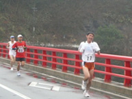 10qの部のスタートは11時からと時間に余裕があるのはいいのですが,空模様の方は雨が時折激しく降ったり,一時小止みになったりの繰り返しでコンディション作りに苦労しました。本大会はスタート20分前から最終点呼が行われるので,こたろ〜君のゴールシーンは見られないまま,同時スタートの5qの選手と合わせて38名が,スタート2分前にスタートラインに並びました。号砲一発ハナを切って飛び出していったのは,5qの部選手ではなく10qの選手でした。その後に5qの部の先頭集団が続き,私はその後ろで10qの部4番手の位置にいました。コースは土師ダム貯水池八千代湖の湖畔を2本の橋を渡って周回するもので,特に気になるようなアップダウンもなく,まずは平坦といってよいコース設定でした。スタート時点では雨はほとんどあがっていましたが,気温も高く体が冷えるような状況にはなりませんでした。最初の橋を渡ったところで距離合わせのためと思われる折り返しコースを走り,後続とはほとんど差がないことが確認できました。周回コースは一周5qなので,10qの部はコースを2周することになります。1週目終了時点のラップが19′16″でした。二日前に9割以上の力で22qを走ってその疲れが抜けていない状況下で,このペースは速過ぎました。2周目に入ると5qの部の選手がいなくなり,前を行く選手は視界に入るか入らないかくらいまで離れていたので,順位をこれから上げることはほぼ不可能でした。後半いかに粘れるかが問題だったのですが,残り2qを切った辺りからペース維持がかなわなくなりました。結局2名の選手にかわされてゴールすることになりました。それでも記録は10qの自己新記録です。また,後半の二週目も19′18″で走っており極端なペースダウンはありませんでした。体調が申し分なければもっと勝負できたのにとの悔いは残りますが。