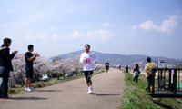 会場の三次市十日市親水公園周辺の桜は昨年同様満開でした。しかし,昨日の雨でスタート・ゴール地点のグランドはぬかるみになっており,しかも三次を三次たらしめている霧が深く気温はかなり低くなっていました。1/4マラソンのエントリー数は200人を超え,出場者は年々増加しているようです。スタートの号砲が鳴る頃には霧も晴れ気温も上昇加減で,コンディションは上々になってきました。10時20分にスタートすると,ブロディさんが3番手に着けてどんどん飛ばして行かれました。私は今一つ自分の調子がつかめなかったので,40′を切ることを目標にイーブンペースで行くことにしました。しかし,ストップウォッチの操作を間違え時間が計れなくなっていました。どうも増えた出場者は実力者が多かったとみえ,昨年は1桁台の順位で走れた前半も20位前後を走ることになりました。経過時間は分からないもののほぼイーブンペースで走っている感覚はあったので,後半もこのままのペースを維持したいと思いました。風はほとんど無かったので走りやすくはあったのですが,最後のラストスパートにも追い風が吹かず,結局最初から最後までイーブンペースで走ってしまいました。田舎の小さな大会でこじんまりとしたよさがあったのですが,こんな大会でもレベルアップの波が押し寄せてきているようです。 ブロディさんが3位入賞されたので閉会式まで残っていました。そこでブロディさんのご家族と昨年のえびだい以来の再会となりました。御令嬢はブロディさんの獲得されたトロフィーに興味津々のようで,しきりにケータイカメラで撮影されていました。 (サスケ)