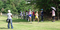 種目は昨年からふれあい駅伝が実施されています。これは6qを6人以内でリレーするもので,襷渡しの場所はコース内のどこでもOKというものです。今年から遠来賞が設けられ,埼玉県・神奈川県・鹿児島県からの出場者が受賞していました。それとふれあい駅伝には飛び賞もありました。 |