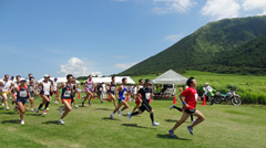 当日の三瓶高原は快晴で,朝から強い日差しが照りつけていました。正確な気温は不明ですが,会場のアナウンスは「30度を越えている」ことを何度も伝えており,かなりやばいコンディションです。倒れない程度にゆっくり走ることにしました。8kmの参加者は,自分の部門だけで40人(昨年27人),全体では126人(+出雲工業高校の現役陸上部員23人)となり,スタートラインはいままでになくにぎやかです。スタート後の直線をのんびり走っていても周囲にたくさんランナーがおり,きっと後ろにもまだまだいるので気が楽・・・と思っていたのですが,180度ターンしてすぐに最後尾バイクが走ってくるのが見えました。参加者が増えてもレベルの高さは相変わらずです。 西の原の草原には,焼けるような陽射しの中でも心地よい風が吹いており,初秋の気配もかすかに感じられます。走る方角によってはこの風でうまく熱を冷ませたのですが,上りではほとんど無風(弱い追い風?)となってしまい,いくら水をかぶっても追いつきません。1周3kmを回ったところで早くもバテました。その後2周目の上りでは歩きが入ってしまい,3周目の残り2kmはもうヘロヘロで足を動かすのがやっとでした。記録は45:16で部門29位。今大会堂々のワースト記録となりましたが,倒れなかっただけ良しとします。