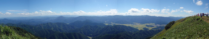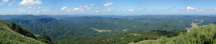 10Kmの部に、和崎さん、テツさん、原田さん、ハコさん、土井さん、石野さんと参加しました。中村さんは申し込んでありましたが欠場です。5時30分頃に宇部を出て6時40分頃に到着し近くに駐車することができました。今年の夏は暑いのでほとんど練習せず、お腹もポッコリしてきたので、上りになると足が動きません。レースは8時20分にスタートし、最初の3Kmの平坦は走ったものの上りになってペースダウンです。テツさんと土井さんは、8.5Km付近まで前に見えていました。石野さんにゲレンデ前の給水のところで抜かれ、その先でテツさんと和崎さんを抜いたものの、すぐに抜き返されました。無理をせずに歩きを入れたので、最後の急登もゆっくりですが割と楽に上り頂上へたどり着きました。 ゴール後の下りは、天気が良かったので靴が泥んこになることはありません。降りてみたらソーメンに今までにない長蛇の列ができていました。列に並ぶのがいやなので、人がいなくなってからソーメンとトマト1個をいただきました。 十種ヶ峰は県境にあるとのことで、車で上ってみたら少しだけ島根県に入るところがありました。完走の証をもらって、1時過ぎに願成就温泉に行きましたが、駐車場も洗い場も湯船も空いていました。 (桜井) ![]() ![]() 山頂ゴールからの絶景(上:日本海を含む北側,下:西中国山地を含む南側)