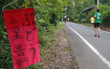 その後「那須一族の墓」エイドまでの上りを歩いていたら,急に横から声をかけられ,なんとツガニさんが抜いていきました。遙か先を走っていると思っていたのに・・・。仁井山を越えると,残り6kmは下りと平坦が主体です。ここから巻き返しを図りたいですが,残り6km地点での経過時間が1時間25分。気を緩めると2時間を超えそうです。急な下り,むやみに入り組んで距離の長い青野ダム湖,残り2kmの下りを必死で走り,なんとか2時間は切りました。 記録は1時間57分35秒で,昨年の自己ベストから一転,自己ワースト更新です。もっとも,自己記録は良い方も悪い方も1時間50分台どまりなのですが。 熱中症が懸念された天気は,スタート後は概ね曇り空となり,台風の影響か風が強めに吹き,体感上は昨年より涼しかったように思います。 参加賞に大きな変化がありました。ぶどうの箱が例年より小さいので,もしやと思い開けてみると・・・なんと,去年までは6房あったぶどうが2房に!(涙)しかし,家に帰ってよく見ると,昨年までのぶどうより粒が大きく,しかも「種なし」になっていました。「量より質」への転換だと肯定的にとらえることにします。・・・4房あればもっと嬉しいのですが。 (和崎)