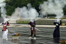 エリンギの場所は「自転車競技施設」という広くて屋根のある最適な場所があったので、こっそり(どうどう)と明るいうちが宴会です。お腹がいっぱいになって、隣のカエルの声も気にならず早めに眠りました。しかし、えびすたいこくと同じように2時前には目が覚めてしまいました。「自転車競技施設」はロングコースの11.7Km地点のエイドになります。道を隔てて反対側の放牧地がトレイルのコースになっていて、朝のうちに柵のそばを歩くと牛の群れがついてきましたが、レース中はいませんでした。当日は6時半過ぎに受付を済ませました。参加人数はロングが30人、ショートが31人と少数です。朝のうちに降っていた雨もレース中は上がってくれました。開会式でロングの部は23Kmくらい、ショートの部は12Km?くらいとの説明がありました。めたろ〜さんのGPSによると23Kmくらいだそうですが、実際に走ってみるともっと長いのではないかと感じました。スタート前の出走者コールは時間の都合で省略、スタートは8時ですが松江城鉄砲隊・姉さま鉄砲隊の演武で試射が何回もあり遅れました。アバウトでなかなか楽しめる大会です。 ロングとショート同時スタートですが人数が少ないので混雑はありません。里山のような場所をアップダウンを繰り返して走ります。めたろ〜さんはすぐに見えなくなりました。コースも全般に比婆山のようにぬかるみはなく靴もそんなに汚れませんでした。 要害山の上りは200mほどの上りで折り返しですが和崎さんはすぐ後ろにいました。下ってみざわの里エイド(5.3Km)に47分ほどで到着です。それからしばらく里山を走ってロングとショートの別れになります。ここまで、めたろ〜さんにOさんが着いていたのですが(若い女の子でなかったので)逃げ切ったそうです。Oさんは5位でゴールです。 ここから長い舗装路を走り、トレイルコースに入り、また舗装路の峠を越えて放牧地に入ります。自転車競技施設エイド(11.7Km)に1時間34分ほどで到着、トレイルコースに入る頃に、放牧地を和崎さんが走っていました。 しばらくトレイルコースを走りましたが上りは急ではありません。それから山道、舗装路をかなり長く下ってこのままゴールだと拍子抜けと思っていたら、山に入りました。急ごしらえの悪路と急な上り下りがありましたが距離が短いのでそんなに苦しくありません。もう終わりかと思ったらまた上りになり、何度か繰り返しです。順位は19位とのことでそのままの順位を保ちました。ガードレールを乗り越えて土手を下るところで左足をひねってケイレンをおこしましたが、ゆっくり走って回復です。残り2Kmからは最後の山越え、舗装路を下っているとゴールが見えて、長い橋を渡ってゴールにたどり着きました。 時間は3時間27分ほど、めたろ〜さんが表彰台に上がって表彰されていました。コースは普段使っていないようなところが多くあり整備するのは大変と思います。全体的に面白いコースで上りもそんなにきつくないので楽しめると思います。給水は2箇所、今回は飲みかけの350ccのスポーツ飲料を持って行ったのですが足りないことはありませんでした。 (桜井)