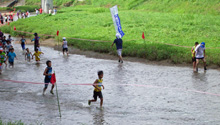 10時40分のスタートを前に川に入ると,高温続きの割には水温が低く,多少生き返った気分になりました。昨年と違ってかなり前のほうからスタートを切ることができたので,早目に自分のペースで走れるようになりました。今年はいったん河原に上がって陸上を走る区間が長くなったようで,これは好都合と思いきやその内半分はぬかるみをはしるようになっていました。そのため陸上区間でペースアップと考えていたのですが思うに任せません。結局淡々と走り(歩き)続けるのみでした。最終折返しに向かっていると,HAKOさんが全体の10番手でゴールに向かっていかれました。あれから順位を上げられたのでしょうか。私は40番手くらいで折返しその後も順位はほとんど変わらなかったと思います。水の中にいる間はあまり暑さを感じなかったものの,水から上がると暑さがぶり返してきたので,会場に長居することもなく,12時前には帰路につきました。 (サスケ)