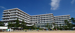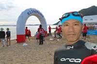 オープンウォーターの大会は初めてです。大会名だけではどこで行われるのかわかりませんね。場所は岡山県。瀬戸大橋の付け根。児島ICから東へ10qくらいにある渋川海岸でした。 瀬戸大橋がすぐそこに見え、立派なホテルもあってリゾート気分満載。ビーチバレーをしている人もいました。しかし昼の腹ごしらえに立ち寄った地元食堂のおばさんに聞くと、最近はレジャーの多様化で真夏でも以前ほどの賑わいはないようです。 いままでのアクアスロンの大会と違って泳ぎの早い人ばかりなんだろうと恐る恐る会場入りしました。予想通り上半身筋肉ムキムキなのに下半身はほっそりとした、いかにもスイム体型の人が闊歩しています。ちょっと気おくれ感もありましたがウエットスーツを着こめばテンション上がってあとは楽しむだけです。天気も最高。ちょっと波は高くても条件はみな一緒です。