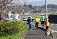 【20Kmエイド、2時間20分】で到着。22Km付近の曲がり角で破れた幟旗に顔が当たり、変だなと思ったら眼鏡がありません。後続の土井さんともう一人のランナーに「探し物?」声を掛けてもらいましたが先に行ってもらい、側溝の水の中でなんとか発見しました。そのあともトイレで頭から水をかぶったときも眼鏡を置き忘れて引き返しています。しばらく上りになり、前に見えるランナーと同じように歩いて上りました。下りなって走ったのですが、見えていた土井さん達4人とは離れて見えなくなりました。