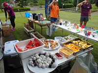 参加者は意外に多く,100人は超えていたようです。スタート/ゴール地点に設けられたエイドも充実していて,飲み物,果物,パン,おにぎり,そうめんなど,参加料1000円で昼食も十分まかなえそうでした。