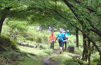 多少緩やかになった下りの登山道を進んで林道に出ました。快調に下っていると和崎さんに追い着きました。靴のソールが破れたとのことで先行です。林道も平坦や上りになると歩き、雨が上がって暑くなったのでゆっくりの歩きになりました。