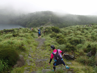 小雨の中6時にスタート、不動池近くまで上って会場に戻り、反対側のえびの岳を周回し、また会場に戻ります。前回と同じコースなのに前回は5.9Km、今回は4.3Kmです。登りで和崎さんに追いついて前後しながら進み、下りで先行しました。