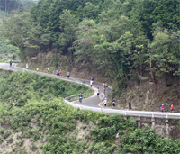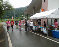 受付混雑のため予定より10分遅れて9:10にスタートし,約3kmで船坂峠の上りに入ります。相当の暑さを覚悟していましたが,レース中はずっと曇りで強い日射しに焼かれることはなく,意外と楽に走れました。峠の途中にあるエイドでは,上ってくるランナーに拡声器を使って声援を送っていました。たいへん威勢がいいので,エイドが見えるまではこの狭い山道を選挙カーが走っているのかと思いました。