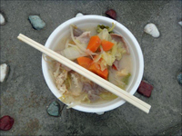 ゴール後、おにぎりと豚汁のサービスがあります。最初に並んだ時には、前の人の豚汁の具は容器に山盛りでした。自分の分の具も容器に一杯入っていました。次に欠場者の分のおにぎりを貰い、誰かにあげようと豚汁を1杯貰いましたが、量が最初の三分の一しか無かったので自分が食べました。