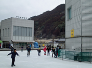 メイン会場となる「コアやまくに」は,中津市山国支所や図書館,劇場などの複合施設で,冬季は建物前に氷が張られスケートリンクも開かれます。大会終了後は多くの親子連れでにぎわっていました。