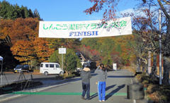 10Kmの部の折り返し地点から1Kmほど先がハーフの第二折り返し地点です。ここから緩やかな下りですがゆっくりしか走ることができません。残り3Kmくらいで第三折り返し地点に向かいます。一旦上ってから下って折り返し、なんとか走り続けて、残り500mからの最後の上りを越えてゴールにたどり着きました。