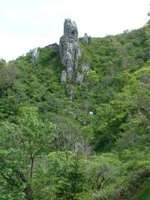 同じ四国・愛媛県の石鎚(いしづち)山(1982m)に次ぐ、西日本第二の高峰。 山上はその名に反し明るい日差しに包まれたなだらかな笹原が広がり、「剣」らしいところは どこにも見あたらない。唯一、山頂手前にそそり立つ「大剣」と呼ばれる巨岩が、いかめしい 表情で登山者を見下ろしている。 この山名は、源平合戦の折り、讃岐国屋島で敗れた平家方の擁する安徳天皇が秘かに阿波国祖谷山 に落ちのび(〜つまり壇ノ浦で入水した天皇は替え玉)、崩御した後に御剣をこの山頂に 埋めご神体としたという言い伝えに由来するもの。 現在は東祖谷山村の見ノ越にある劔神社から山頂を目指す登山道が最も一般的で、マラソンコースも この登山道を利用している。登山道入り口からしばらくは自然林に覆われた木陰の道が続くが、登 山リフト終点の西島からは植生が低木やササに変わり、山頂まで見晴らしの良い道が続く。 (画像は剣山山頂にて。ササに覆われたピークの向こうに次郎笈がそびえ立つ) |