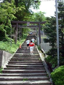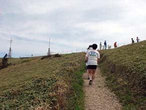 舗装路を約8km登り、トンネルを抜けると、劔神社の石段が待っている。 ここを上りきると、マラソンコースはいよいよ登山道へ。 登山道序盤は、自然林に覆われ暑さはそれほどでもないが、かなりの急坂で まったく走れない。 息を切らしながらひたすら山頂目指して「歩く」。 (左)リフト終点「西島」から剣山山頂を望む。