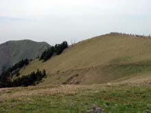 さすが西日本第二の高峰。山頂は遙かに高く、ゴールはまだ遠い・・・ここから先の道は高木がなくなり、傾斜も比較的緩やかとなる。 |