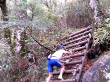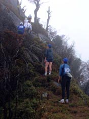 木の根、梯子、ロープなどを頼りに、山頂を目指す。とてもマラソンにはならない。