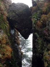 (右)山頂の近くにあるチョックストーン(岩の間に挟まっている岩)。通称「心見の橋」