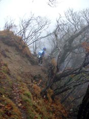恐いには恐いが、落ちてゆく先が霧で見えないぶん、莇ヶ岳の鎖場より気は楽。