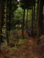 延々と続く急な下り道。周囲の木々が自然林からヒノキの植林に変わると林道は近い。