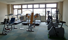浴室には「気泡浴」「寝湯」「圧注浴」「運動浴」など浴槽が分けられ,トレーニングルームも機器が揃っている。