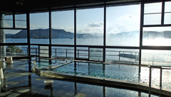 露天はないが,内湯の窓越しにいろは島の眺望が広がる。