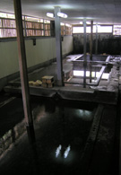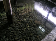 浴槽は3つあり、それぞれ湯温が異なる。源泉温度が高い(86.0℃)ため山の湧水で薄めているが、いずれも透明度が高く、底に敷き詰められた石がよく見える。湯気が立っていなければ、川魚やカエルがすいすいと泳いでいそうな「川底」そのものである。浴室は壁で囲われ、少ない電灯と竹の格子戸からこぼれてくる外の光が室内を柔らかく照らす。水音を聞きながら、ほの暗い川底にいつまでも足を浸していたくなるような、心地よいひとときだった。 | ||||||||||||||||||||||||