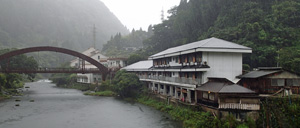 旅館の建物から地下に下った駐車場の端にある内湯は,窓からすぐ側を流れる川が一望でき,半ば露天風呂の趣。効能の異なる2つの浴槽と打たせ湯があり,比較的透明度の高い「胃腸湯」に対し,「きず湯」は濁り湯の中に大量の湯の花が漂っている。 | ||||||||||||||||||||||||