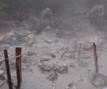 入浴場所は3ヶ所に分かれており、とりあえず宿の人がすすめる「竹の湯」に入ってみた。明礬緑礬泉(酸性硫化水素泉)の湯は別府温泉保養ランドの泥湯と同成分。こちらも濁っており「泥湯」と謳われている。口に含むと強烈な酸味があり、内からも外からも効きそうな温泉だが、マラソン後の汗を流すには不向きで、今回は竹の湯だけで入浴を取りやめた。入浴後、宿の裏手に広がる「八幡大地獄」を見学。約2ヘクタールの広さで、地面からゴボゴボと吹き出す泥湯や立ち上がる噴気に圧倒された。なお、案内板では「遊歩道」となっているが、山道で歩きにくく、滑りやすいので足下に注意。 | ||||||||||||||||||||||||
