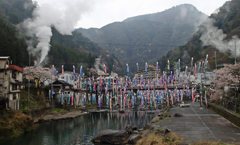 杖立温泉の歴史は古く,応神天皇(伝200-310)の産湯として使われたのが起源と伝えられる。高い効能により,杖をついてやってきた人でも杖なしで帰って行けるまで回復すると言われ,これが温泉名の由来となった。江戸時代は熊本藩の御前湯が置かれ,現在は共同浴場御前湯となっている。